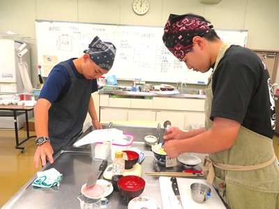 片栗粉でのとろみ付けや卵の入れ方にコツがいるメニューですが、教科担任のアドバイスのもと、手際よく調理する様子が見られました。