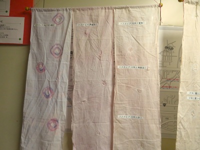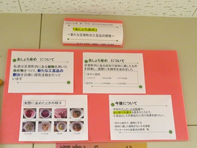 職員室前には、「足寄町の新たな工芸品の開発」をテーマにしたグループが作成した草木染め(「あしょろ染め」と命名しました)が飾られています。